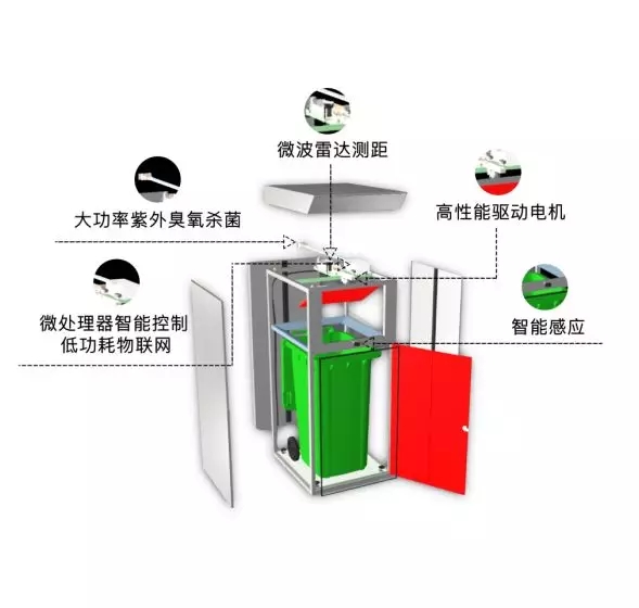 主要功能:紫外线臭氧双重实时消毒、感应开门、溢满预警、箱体倾倒预警、高温预警、清运时效性预警、投递次数统计、投递量统计、清运路线规划。